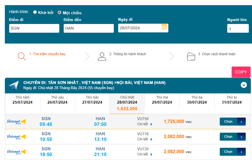 Tân Sơn Nhất (SGN) - Nội Bài (HAN) 28/07/2024