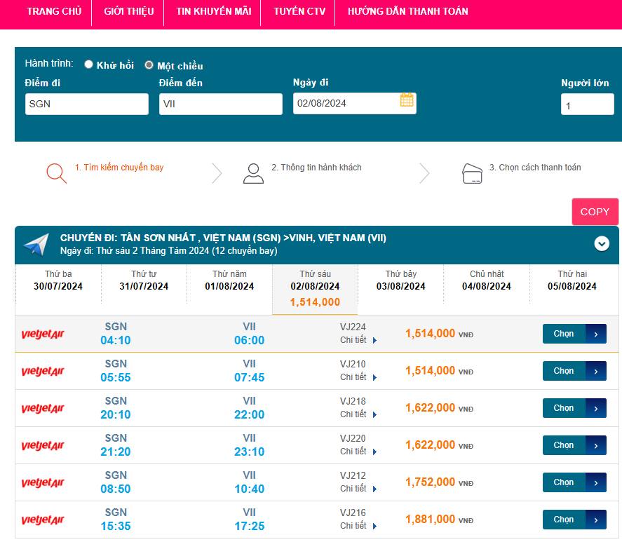 Tân Sơn Nhất (SGN) - Vinh (VII) 02/08/2024
