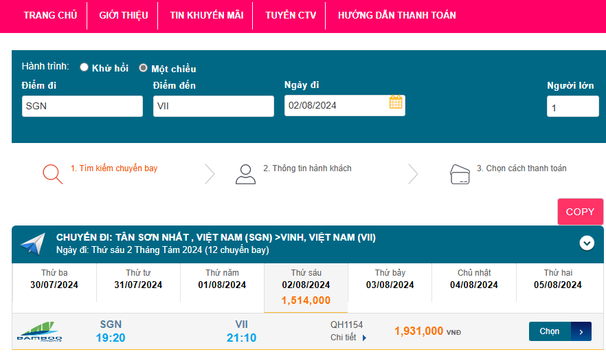Hãng Bamboo Airways QH1154 -> 19:20 giá vé máy bay 1,931K