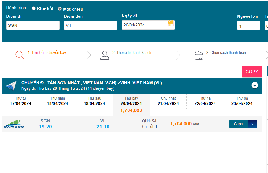 Tân Sơn Nhất (SGN) – Vinh (VII) 20/04/2024