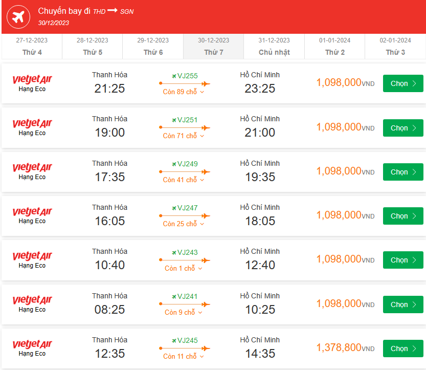 Thanh hóa (THD) Đến Hồ Chí Minh (SGN) thứ sáu 30-12-2023