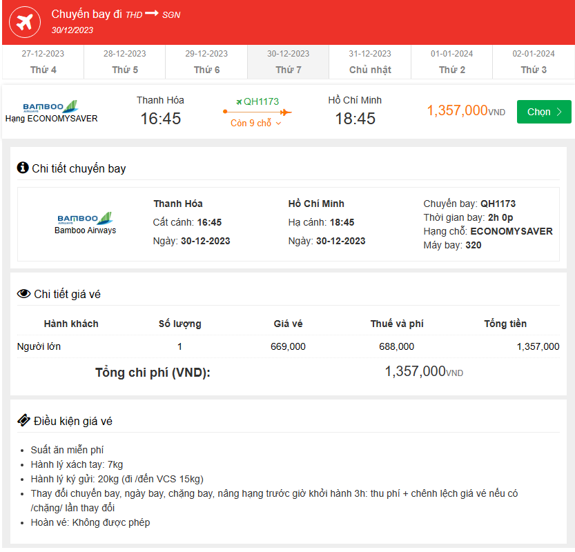 Bamboo Airways Thanh Hóa Cất cánh: 16:45 Ngày: 30-12-2023 Hồ Chí Minh Hạ cánh: 18:45 Ngày: 30-12-2023 Chuyến bay: QH1173 giá vé máy bay 1,357,000VND