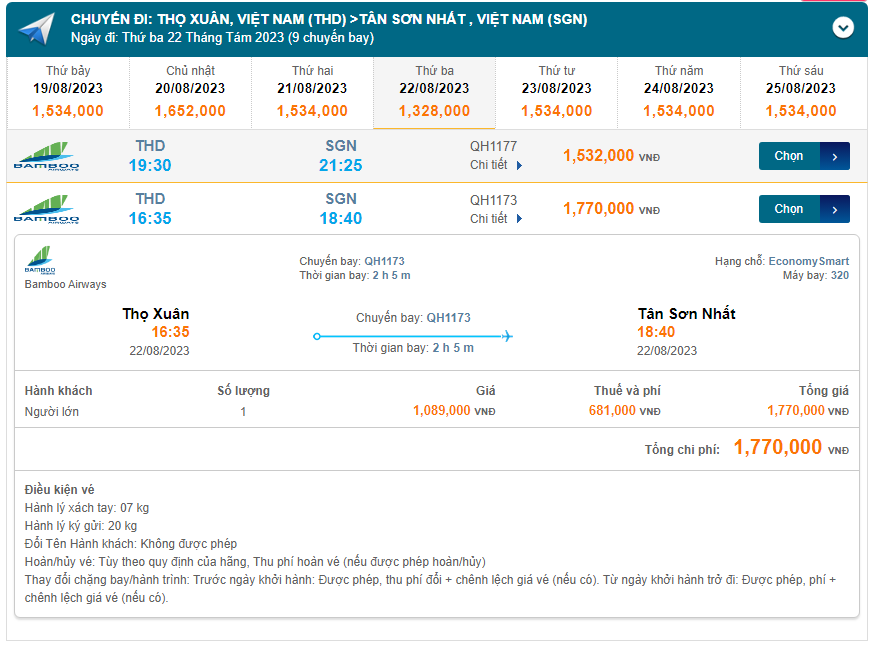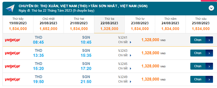 Thọ Xuân (THD) đến Tân Sơn Nhất (SGN) Thư ba 22/08/2023
