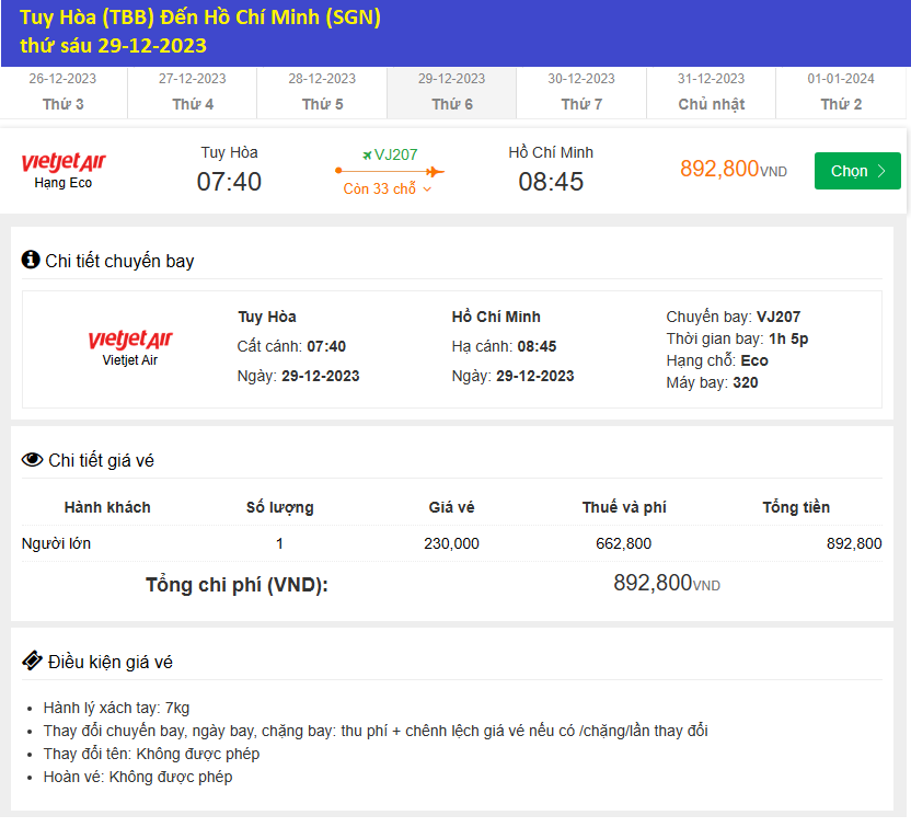 Tuy Hòa (TBB) Đến Hồ Chí Minh (SGN) thứ sáu 29-12-2023