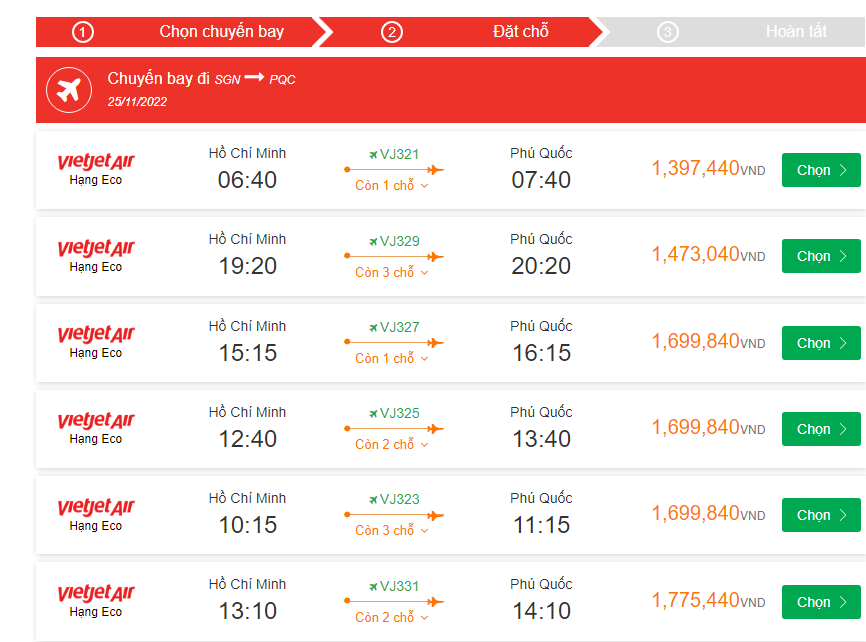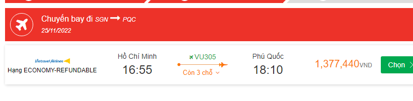 Vietnam Airline Chuyến bay được điều hành bởi: Pacific Airline Hồ Chí Minh Cất cánh: 16:35 Ngày: 25-11-2022 Phú Quốc Hạ cánh: 17:40 Ngày: 25-11-2022 Chuyến bay: VN6523 giá vé 1,483,000VND