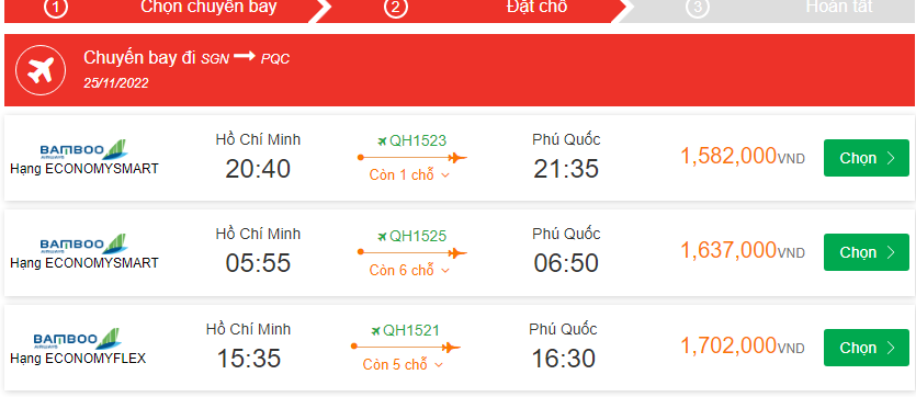 Bamboo Airways SHồ Chí Minh Cất cánh: 05:55 Ngày: 25-11-2022 Phú Quốc Hạ cánh: 06:50 Ngày: 25-11-2022 Chuyến bay: QH1525 giá vé 1,702,000VND