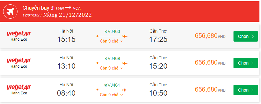 Vietjet Air Hà Nội Cất cánh: 15:15 Ngày: 12-01-2023 Cần Thơ Hạ cánh: 17:25