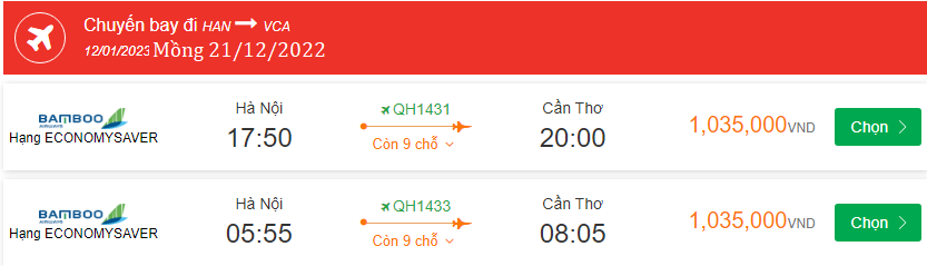 Bamboo Airways Hà Nội Cất cánh: 05:55 Ngày: 12-01-2023 Cần Thơ Hạ cánh: 08:05 Ngày: 12-01-2023 Chuyến bay: QH1433 giá vé 1,035,000VND