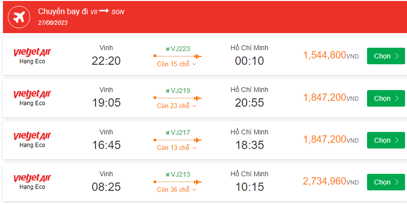 Vietjet Air Vinh Cất cánh: 08:25 Ngày: 27-08-2023 Hồ Chí Minh Hạ cánh: 10:15 Ngày: 27-08-2023 Chuyến bay: VJ213 giá vé máy bay 2,734,960VND