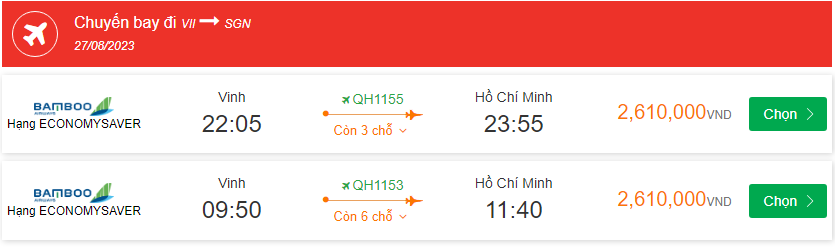 Bamboo Airways Vinh Cất cánh: 22:05 Ngày: 27-08-2023 Hồ Chí Minh Hạ cánh: 23:55 Ngày: 27-08-2023 Chuyến bay: QH1155 giá vé máy bay 2,610,000VND