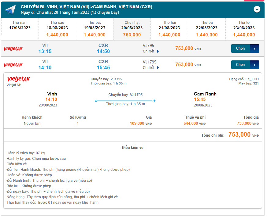 Vinh (VII) đến Cam Ranh (CXR) chủ nhật 20/08/2023