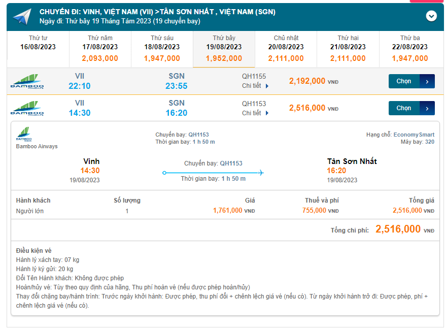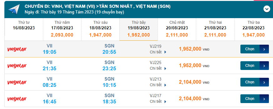 Vinh (VII) đến Tân Sơn Nhất (SGN) thứ bảy 19/08/2023